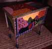 During 1979, Ms. Brant began to experiment with applying her unique visions to furniture, by applying her canvas subjects directly to three-dimensional objects. Thus was born her earliest "Painted Furniture" which progressed to a stage where her work began to sell to local patrons in the Bay Area. Her non-objective style was eminently suited to turn dressers, cabinets, and other functional items into unique, bold visions that suited nearly any modern decor.